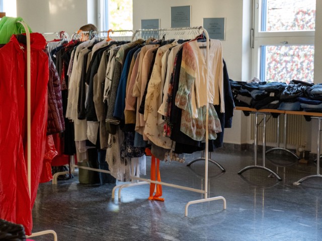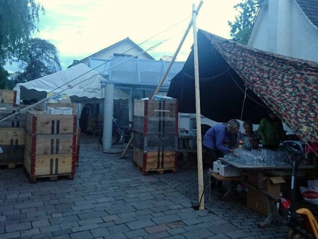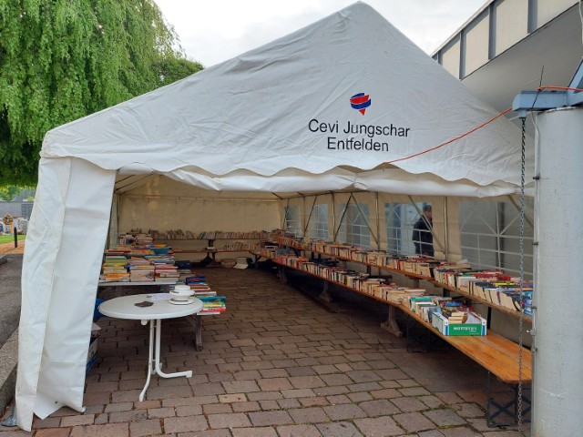 Wir transportieren den ersten Teil des Materials vom JSZ auf den Gemeindeplatz UE. Dort stellen wir einerseits das Bücherzelt auf und beginnen andererseits mit den Arbeiten in der Bächlihalle: Wir stellen Tische und Kleiderständer auf, um die erste Ware für den Verkauf parat zu machen.