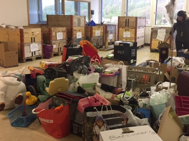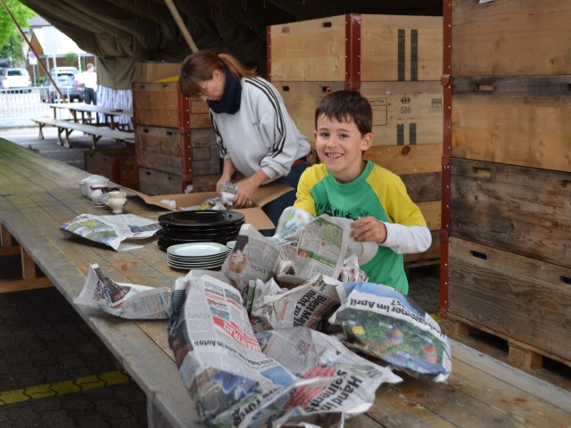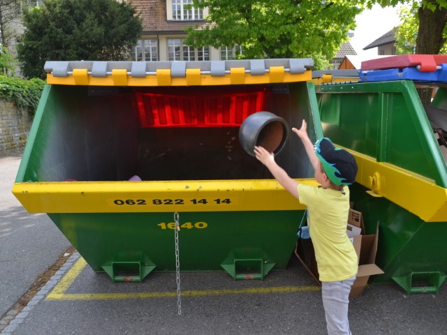 Leider bleibt nach dem Flohmärt immer einiges an Ware zurück, was dann entsorgt werden muss. Die einzelnen Gegenstände fliegen in die entsprechende Mulde. Danach bauen wir die Zelte ab, sortieren und bringen das Material zurück ins JSZ, stapeln die Festbankgarnituren und putzen den Platz.