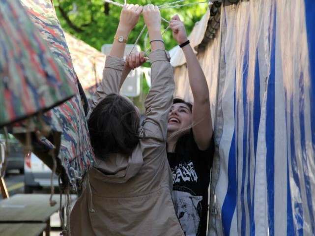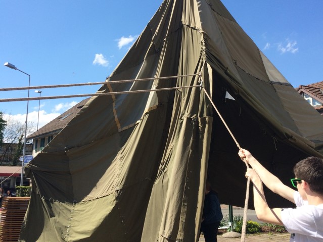 Nachdem wir kurz nach Mittag alles restliche Material vom JSZ auf den Platz transportiert haben, beginnt dort der Aufbau der Blachenzelte. Wir spannen Seile und ziehen die Blachen hoch. Anschliessend stellen wir ca. 50 Festbankgarnituren auf.