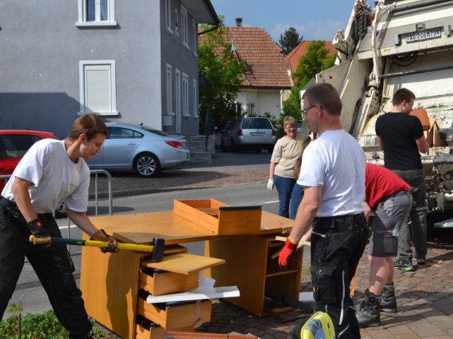 Leider bleibt nach dem Flohmärt immer einiges an Ware zurück, was dann entsorgt werden muss. Die einzelnen Gegenstände fliegen in die entsprechende Mulde. Danach bauen wir die Zelte ab, sortieren und bringen das Material zurück ins JSZ, stapeln die Festbankgarnituren und putzen den Platz.