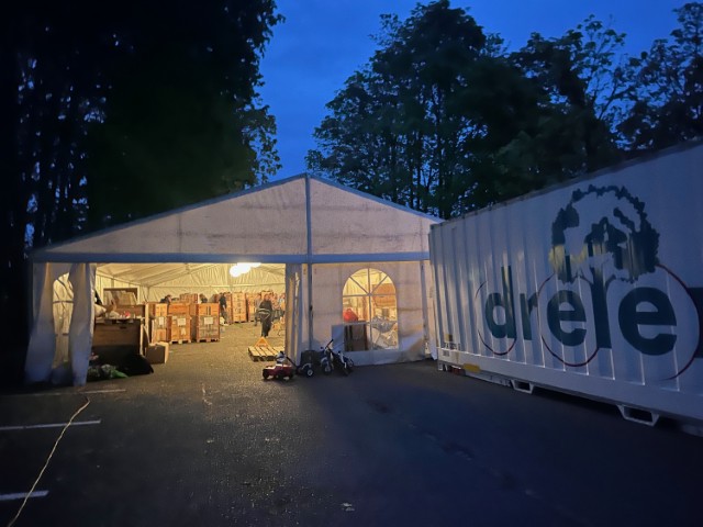 Nun bringen wir die Ware mit Palettrollis aus dem Lagerzelt zu den Zelten, wo wir die Flöhe auspacken und auf die Tische verteilen, um sie für den Verkauf zu präsentieren. Da diese Arbeit einige Stunden dauert, werden alle
